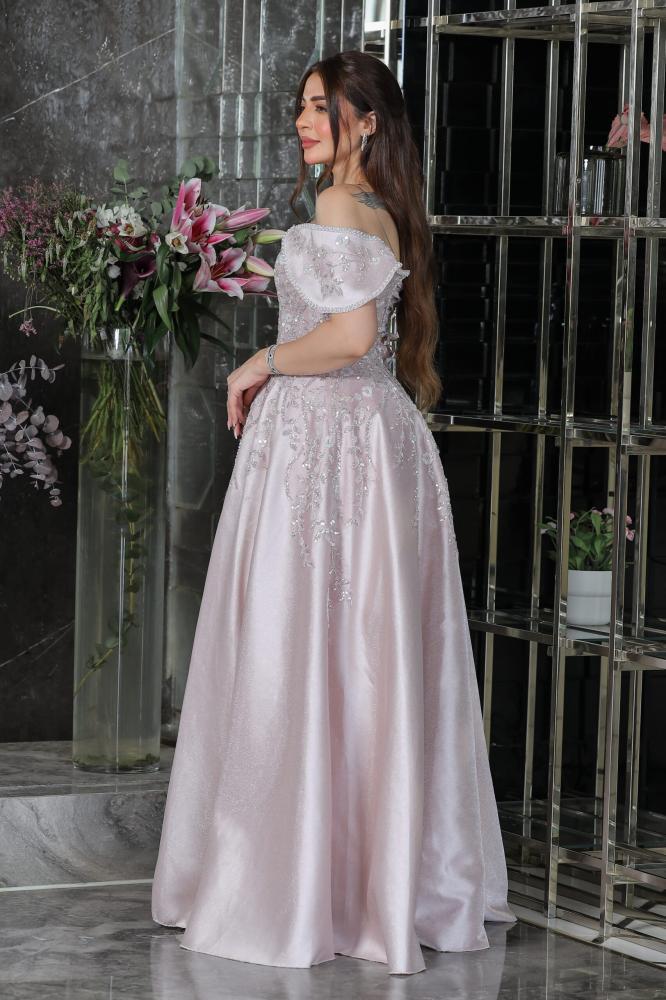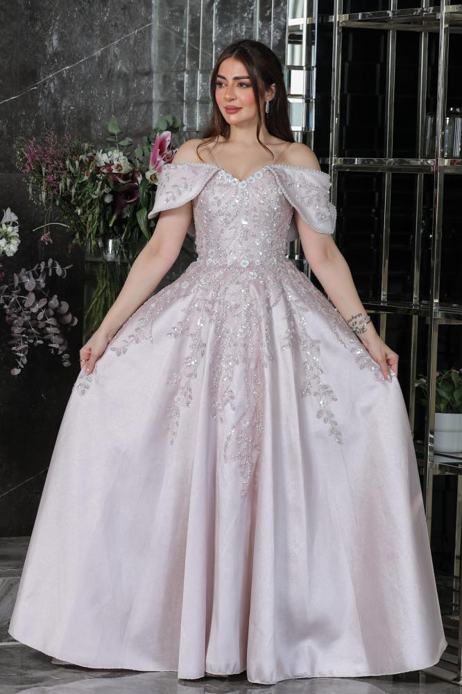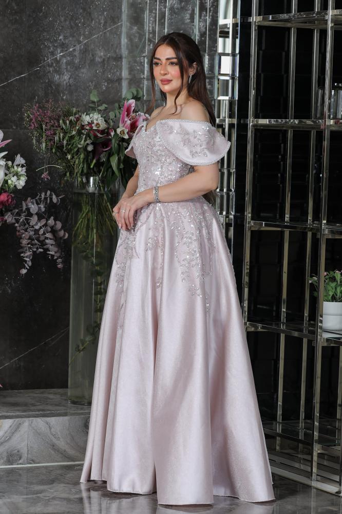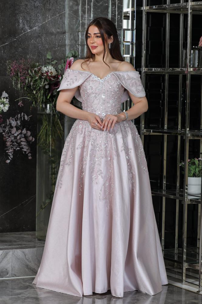 فستان سهرة كلوش مطرز اوف شولدر لون لحمي